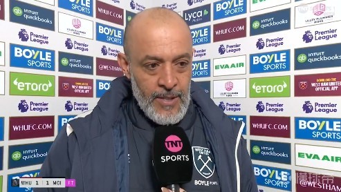 英超第30轮,西汉姆联主场1-1战平曼城,西汉姆联主帅努诺赛后接受了TNT体育的采访。努诺,今晚这场比赛对你们来说拿到这一分非常关键。主场拿到这样重要的一分,现在全队的感觉怎么样?感觉不错。我们都清楚这会是一场非常困难的比赛,对抗很激烈。从防守角度来说,球队的表现可以说非常顽强。大家在防守时拼尽全力,用身体去封堵、去对抗,这一点非常重要。你对整支球队今晚的防守表现有多骄傲?包括门将的发挥也非常出色